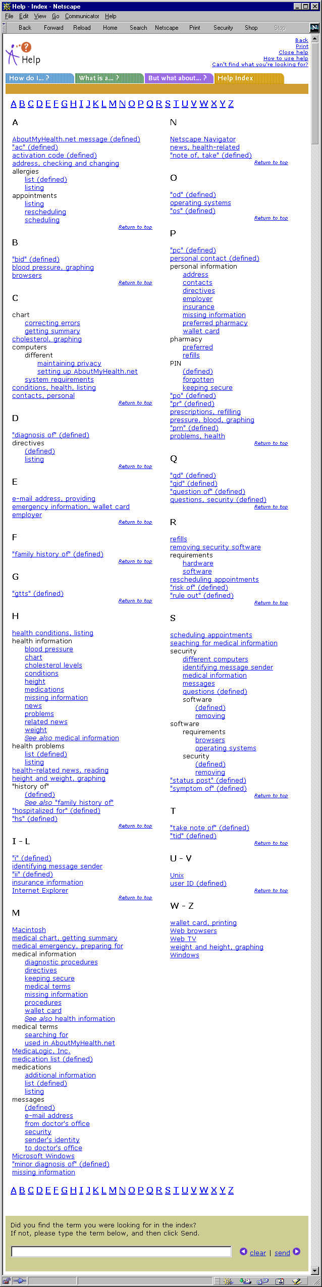 Thanks to MedicaLogic (now a division of GE Medical Systems) for sharing this screen shot of the award-winning help for AboutMyHealth.net, the original version of their web-based application for patient records access.